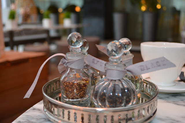 The tea itself takes place outside in the "garden" area- the heart of the hotel. Abundant with outside heaters, as it is still jolly cold, we were greeted by a very very attentive waitress who explained what we would be trying and tasting and asked us which tea we would like first- with of four little sniffing pots! For our first pot of tea(we ended up having two!) we tried Rhubarb and Custard! I was slightly concerned that this may come tasting like some sweet and slightly sickly Sunday crumble, but instead it was subtly infused, warming and delicious!